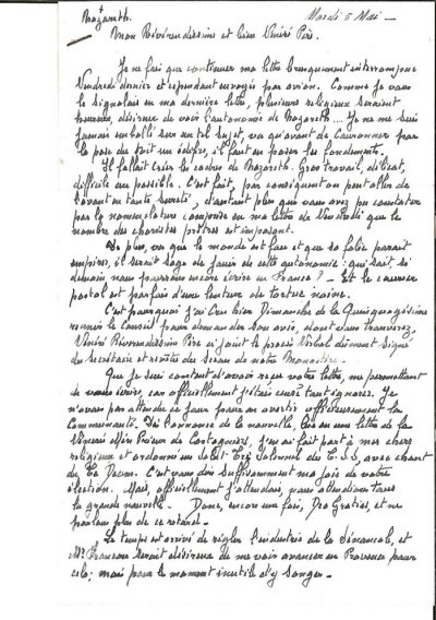 Je ne fais que continuer ma lettre brusquement interrompue Vendredi dernier et cependant envoyée par avion. Comme je vous le signalais sur ma dernière lettre, plusieurs religieux seraient heureux, désireux de voir l'autonomie de Nazareth ... Je ne me suis jamais emballé sur un tel sujet, vu qu'avant de couronner par la pose du toit un édifice, il faut en poser les fondements